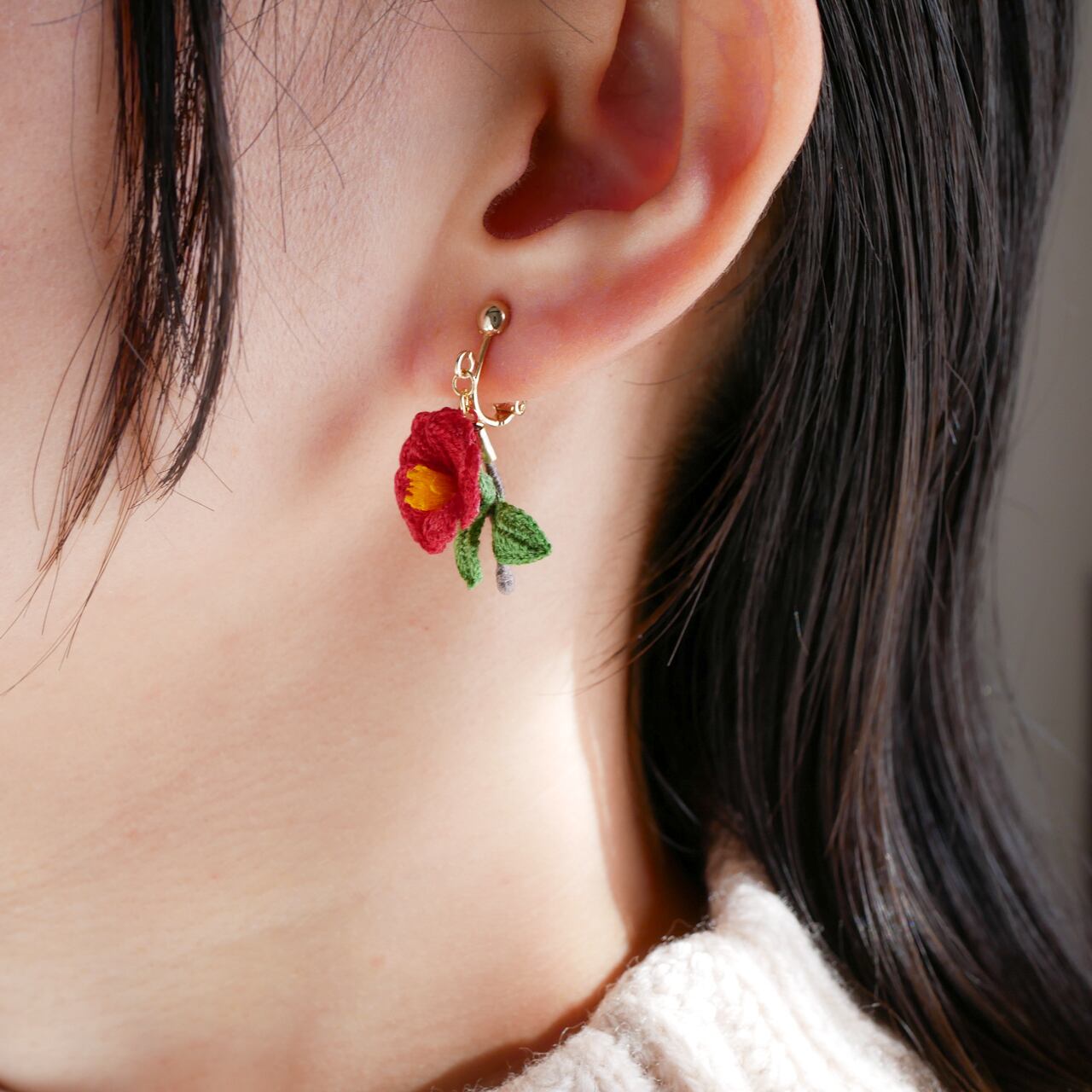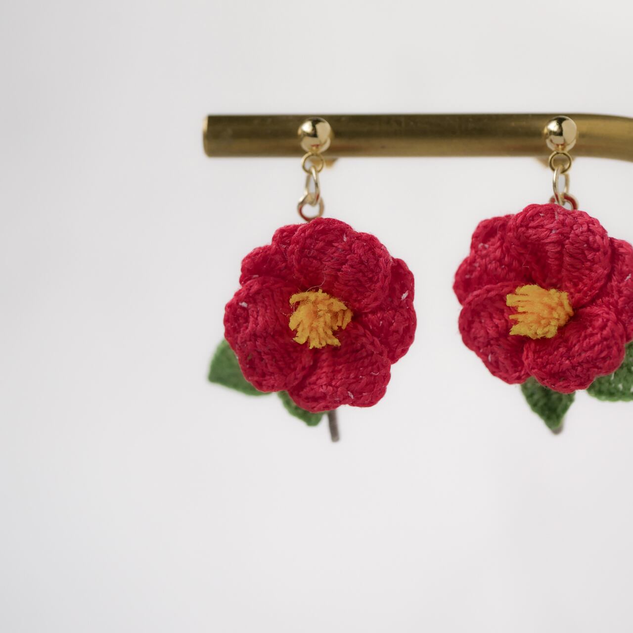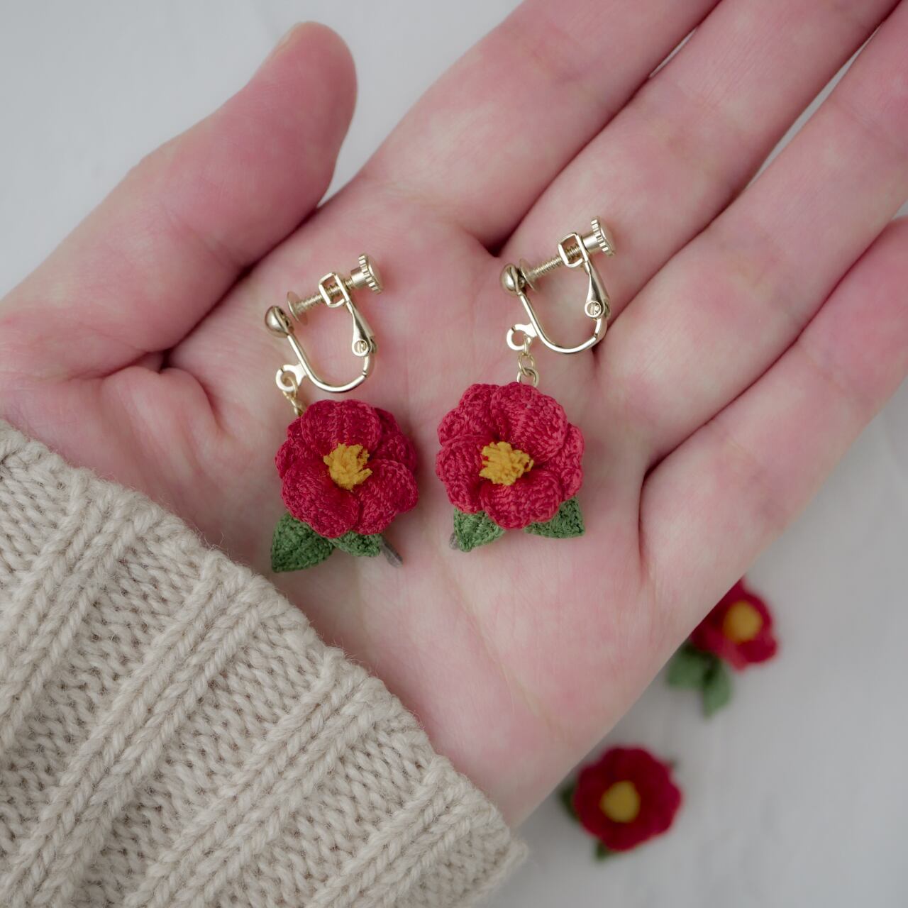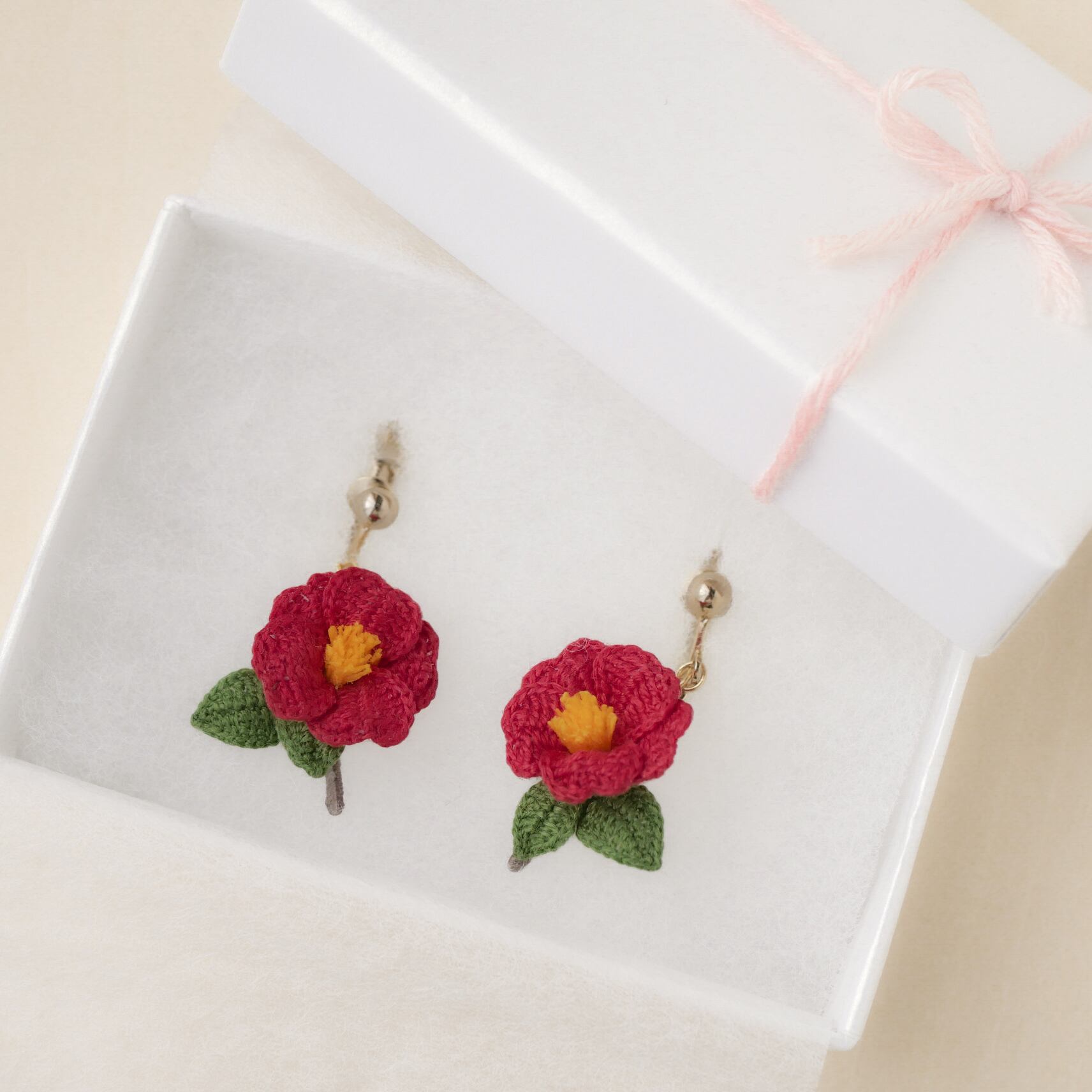 編み物 手編み レース編み 手編みピアス 手編みイヤリング 新年 冬 春 赤 茜色 花 お花モチーフ 冬の花 赤い花 糸の花 ツバキ 贈り物 プレゼント ギフト 誕生日プレゼント ギフトラッピング お祝い 母の日 お正月 初詣 成人式 前撮り 着物 和装 和服 イベント フォーマル オケージョン お散歩 お出かけ ワンポイント ナチュラル 繊細 華やか 揺れる ゆらゆら 軽い