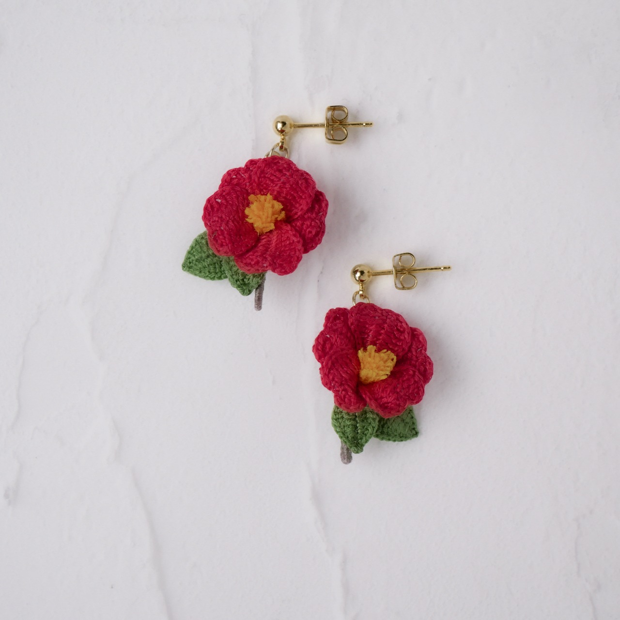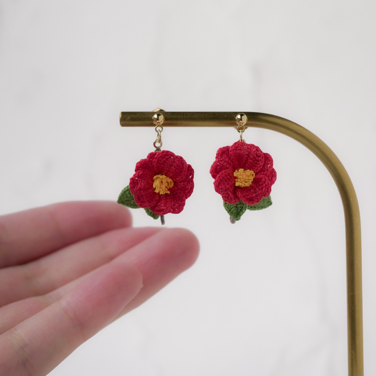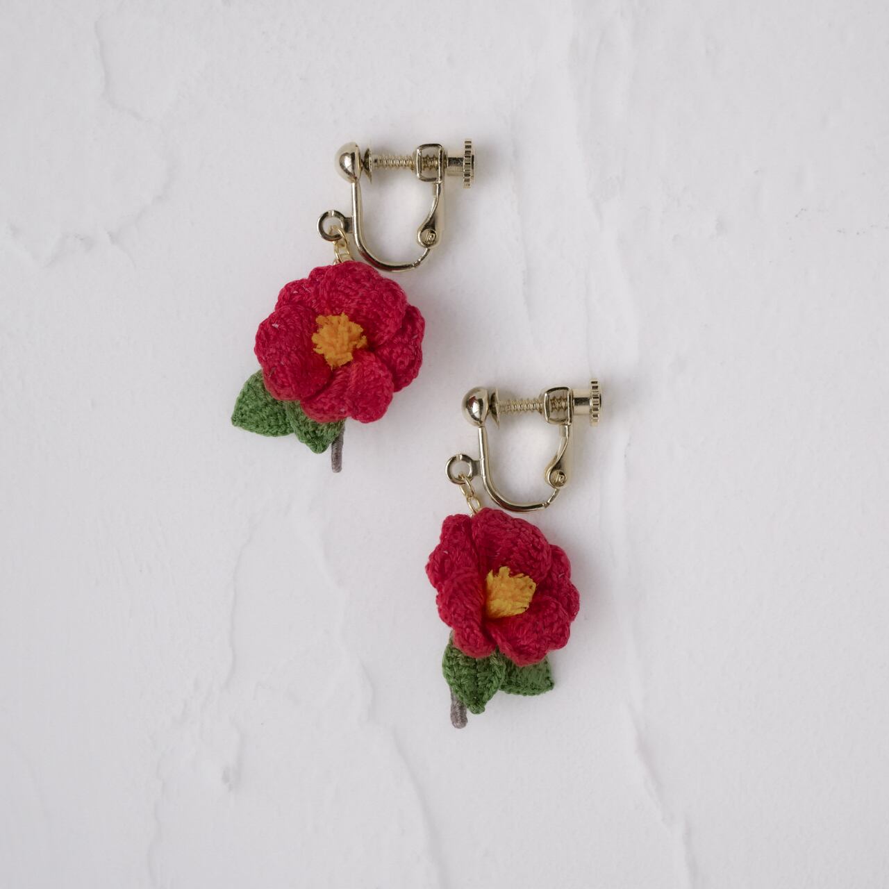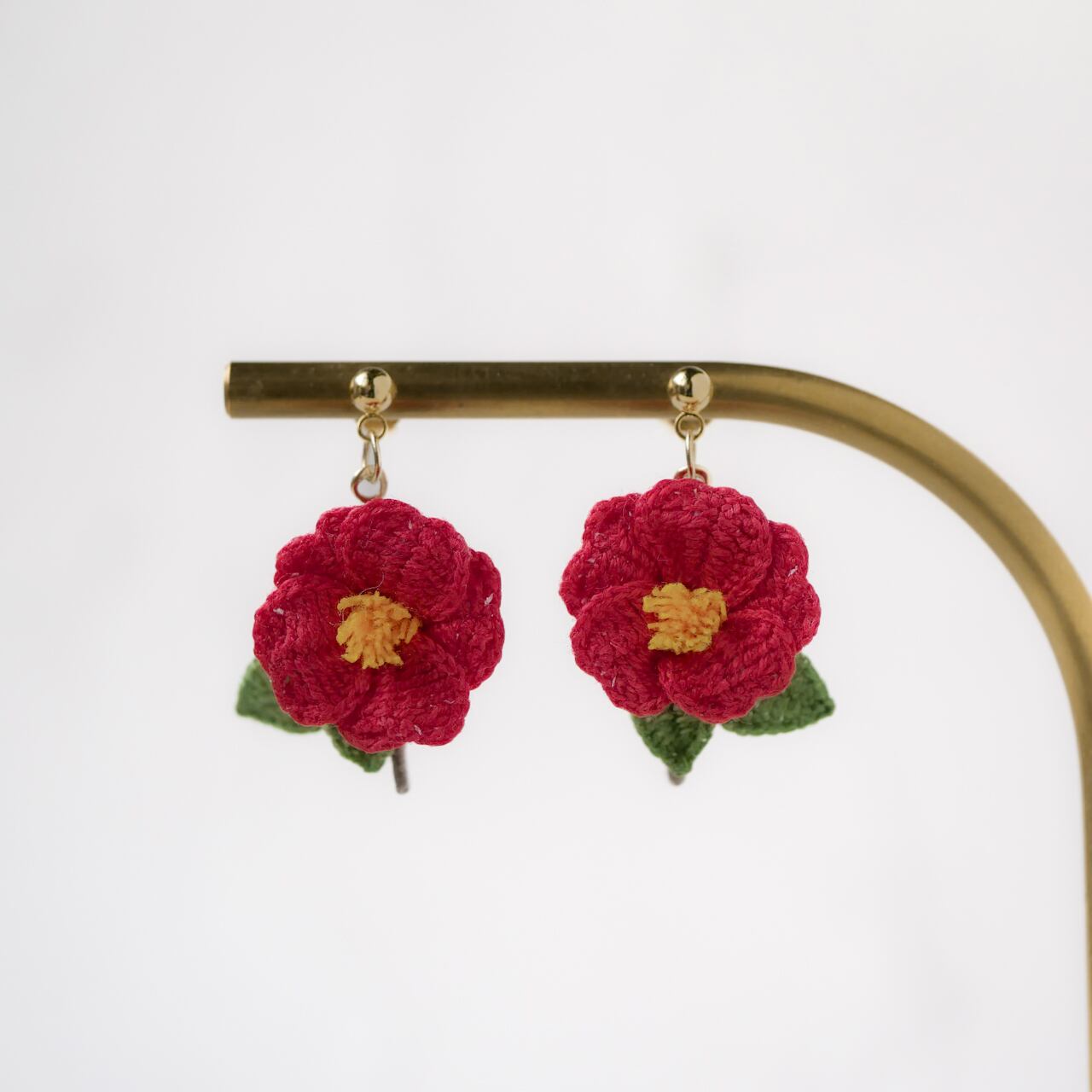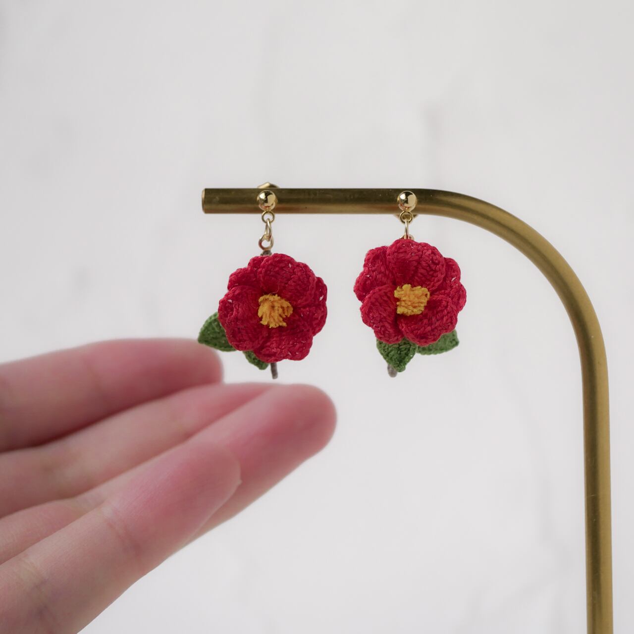 編み物 手編み レース編み 手編みピアス 手編みイヤリング 新年 冬 春 赤 茜色 花 お花モチーフ 冬の花 赤い花 糸の花 ツバキ 贈り物 プレゼント ギフト 誕生日プレゼント ギフトラッピング お祝い 母の日 お正月 初詣 成人式 前撮り 着物 和装 和服 イベント フォーマル オケージョン お散歩 お出かけ ワンポイント ナチュラル 繊細 華やか 揺れる ゆらゆら 軽い