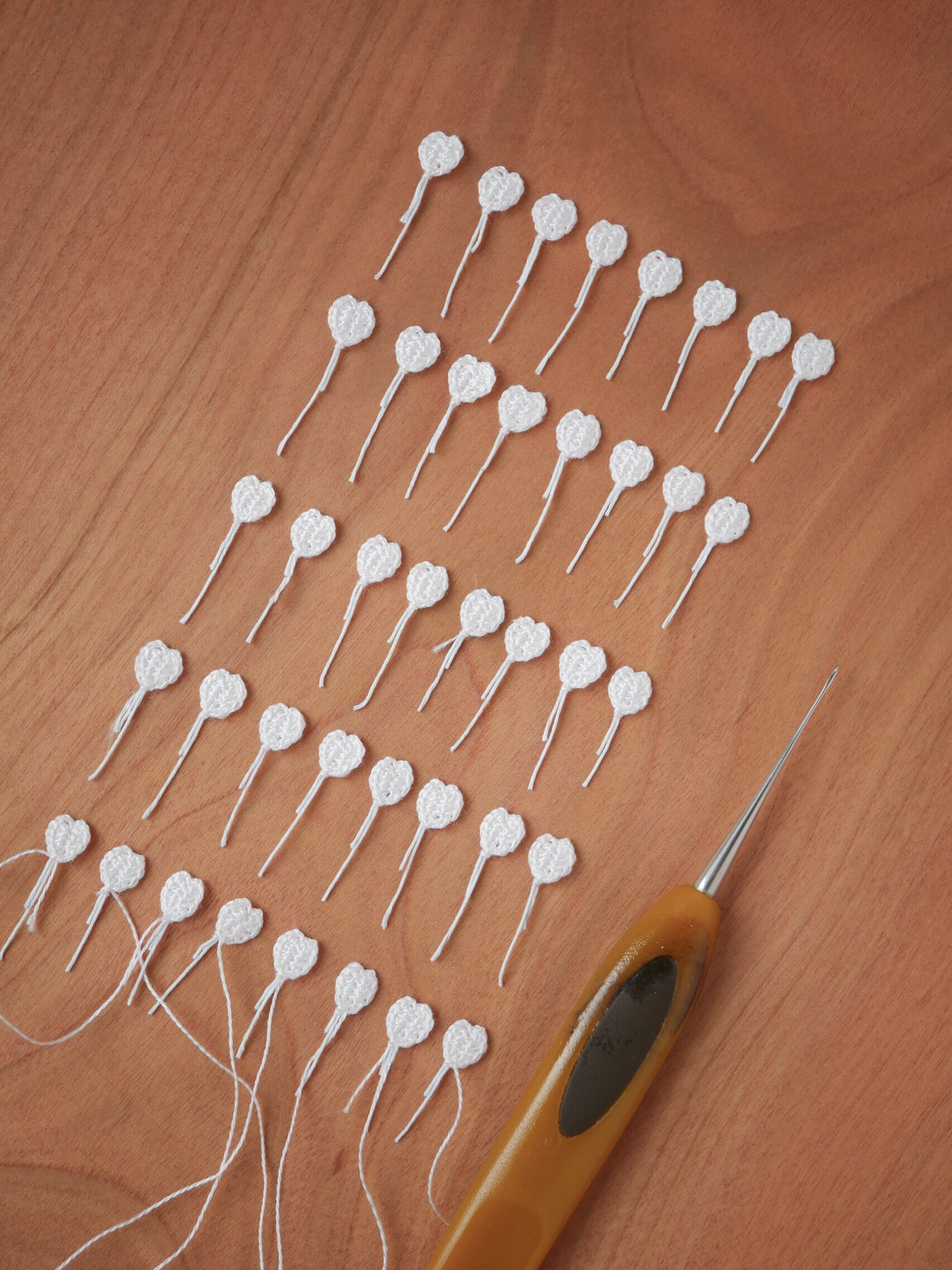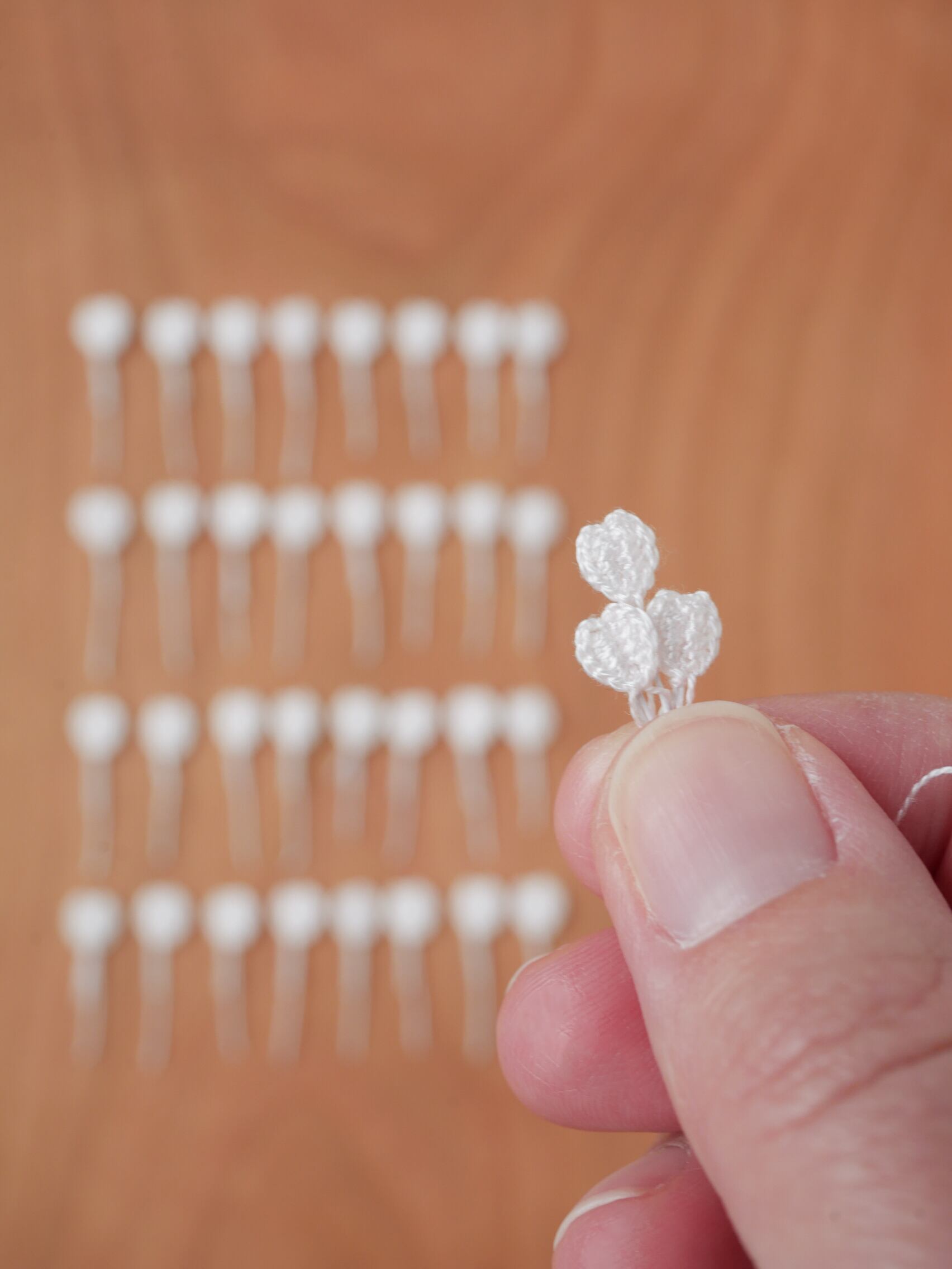 6本に合わさっている刺繍糸を1本にほどき、太さ0.5mmの極細のレース針で、一枚一枚約6mmサイズの花びらを編み上げています。