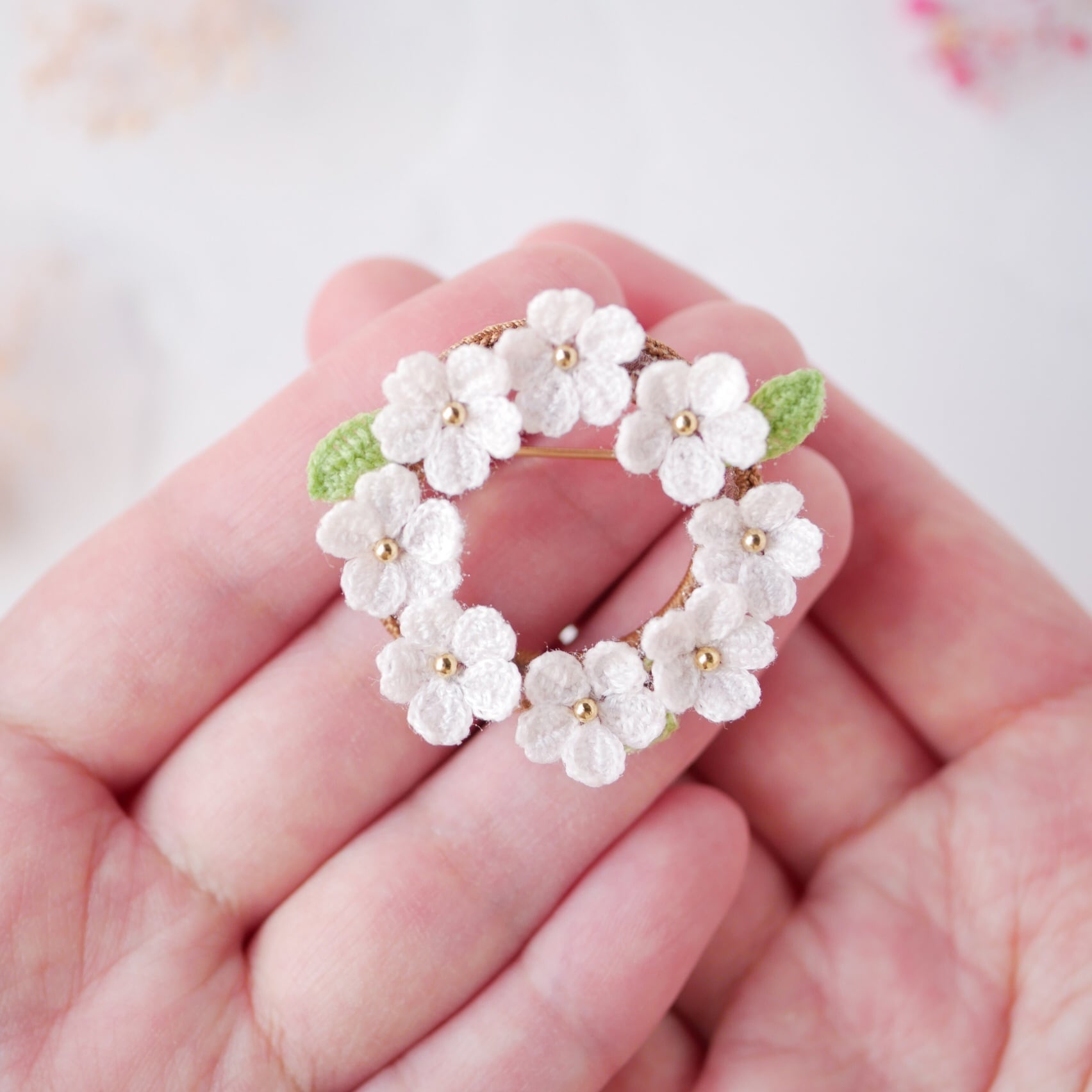 細い刺繍糸を 極細のレース針で丁寧に編み上げた『ソメイヨシノのリースブローチ』 です。