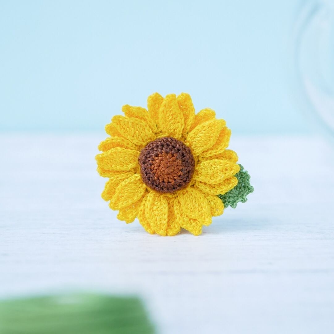 お花の中央部分はグラデーションを出すために、2色の茶色の刺繍糸を用いて編み、ひまわりらしくぷっくりとした膨らみをもたせています。