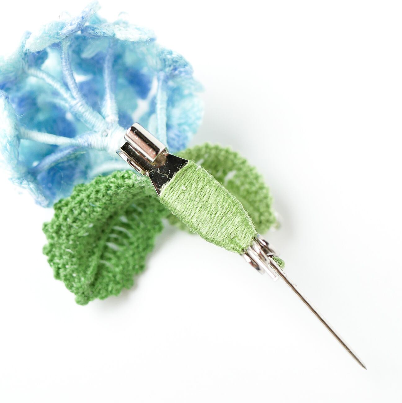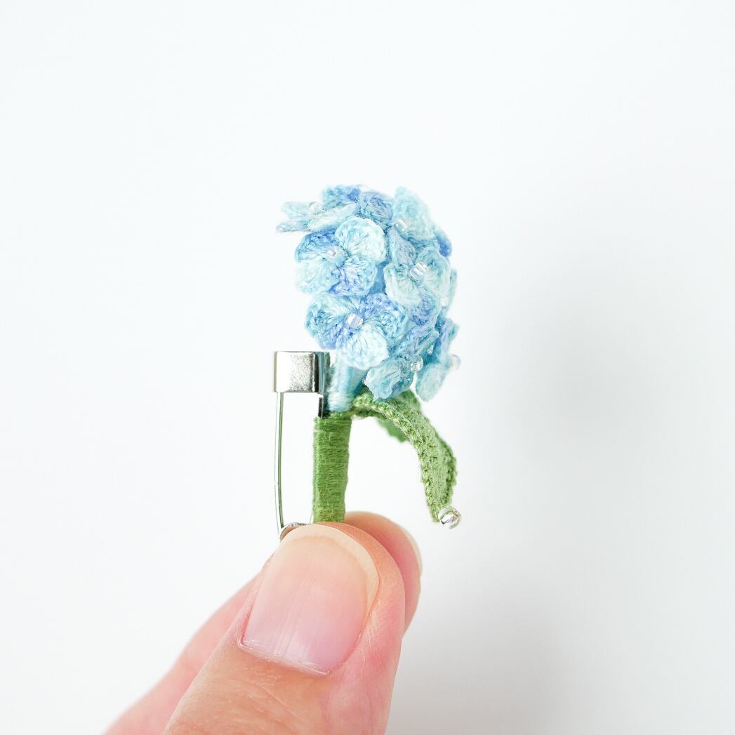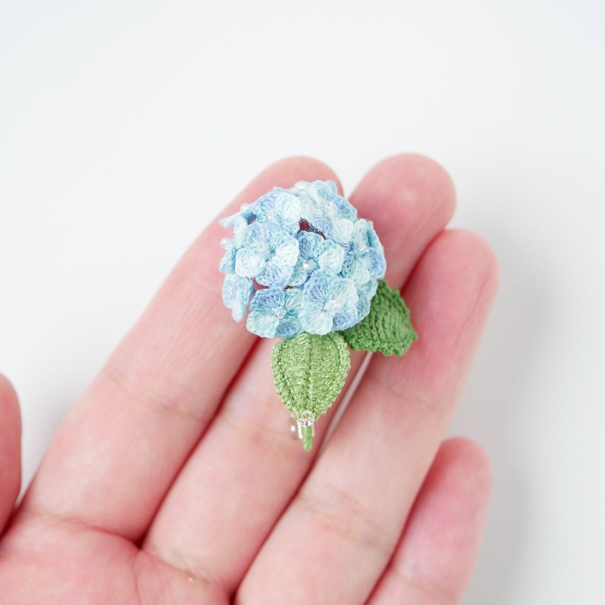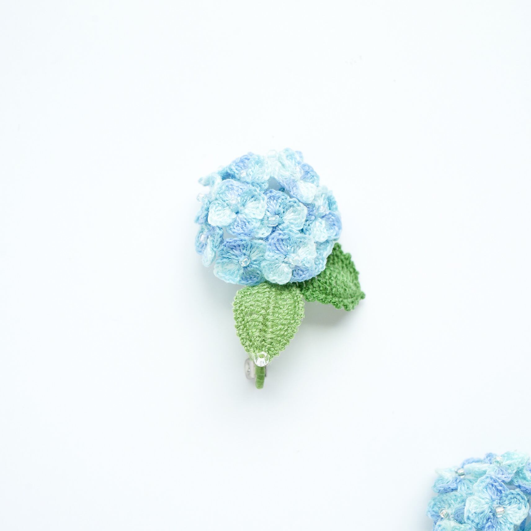 1本にほどいた刺しゅう糸を、レース編みして制作した『あじさいのブローチ』です。