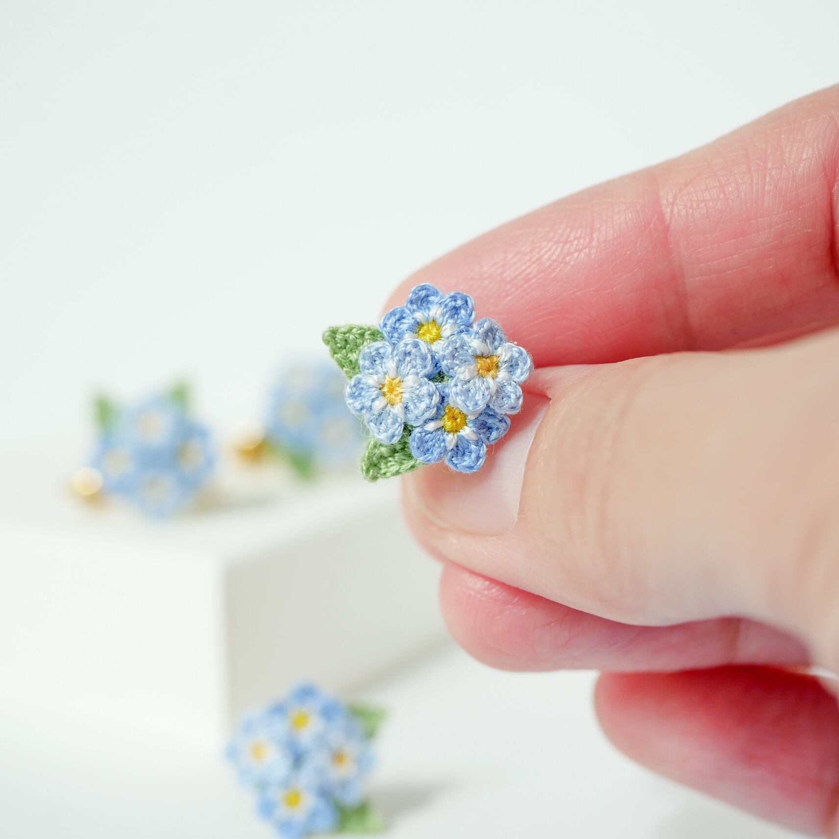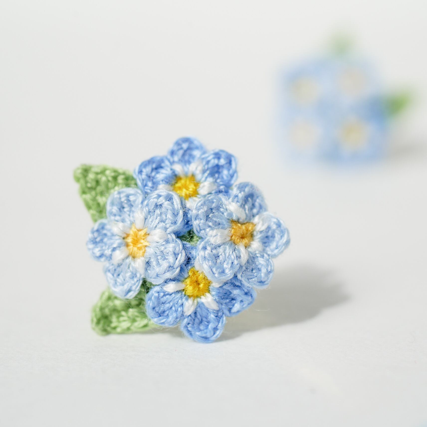 お手元に届いた小さな勿忘草のお花の個性や、手編みならではの温かみ・風合いを楽しんでいただけたら嬉しいです。