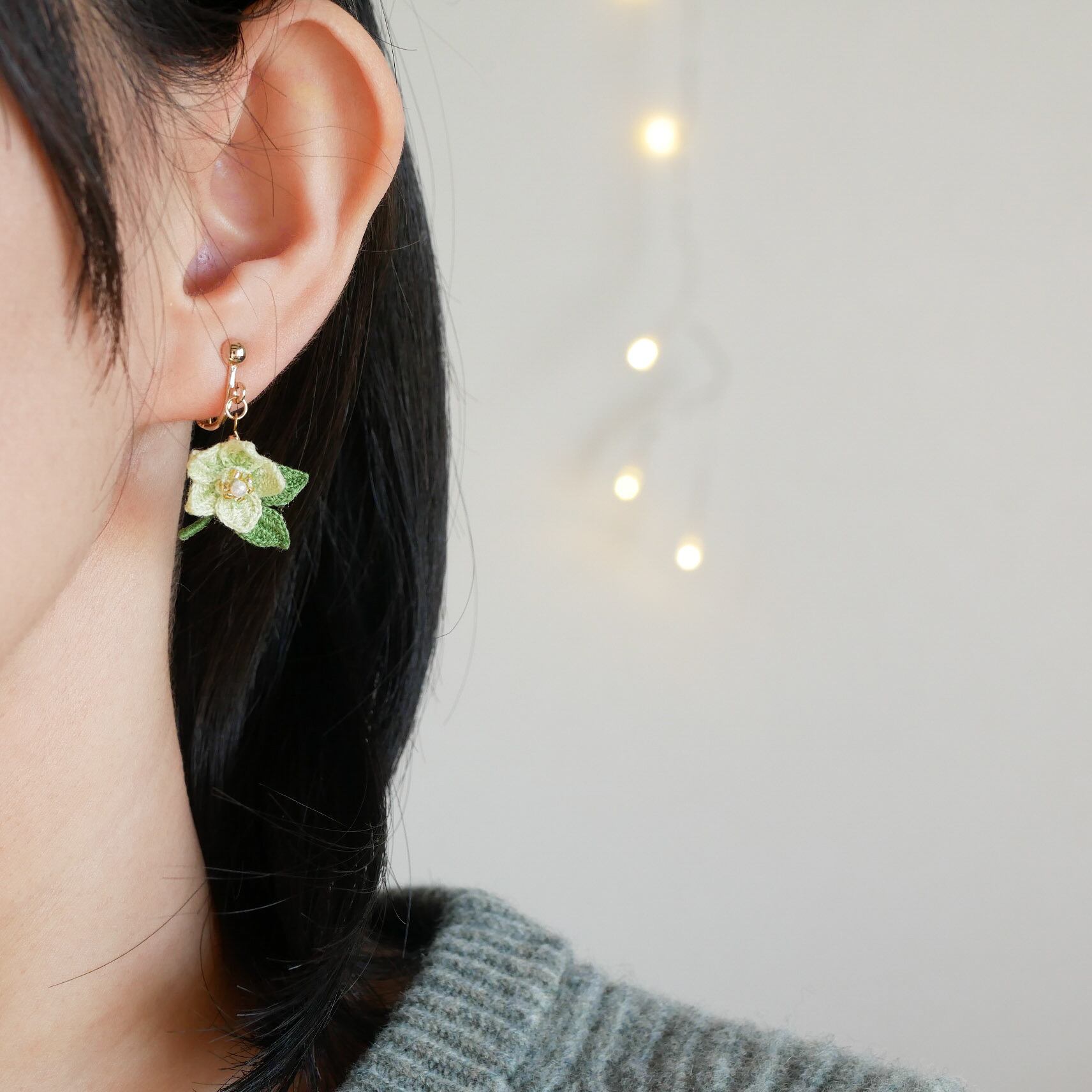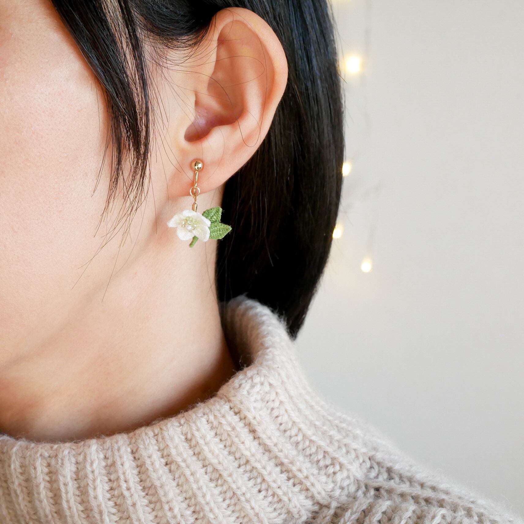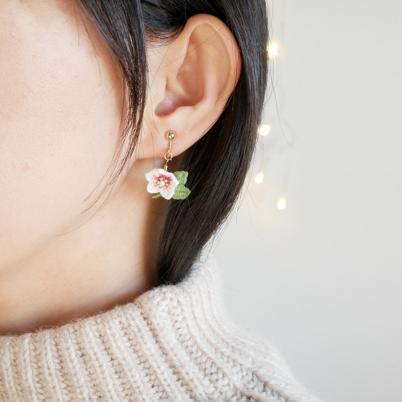 耳元で可愛らしくゆらゆら揺れるクリスマスローズのお花を身につけて、冬から春へのお出かけをお楽しみください✧*。